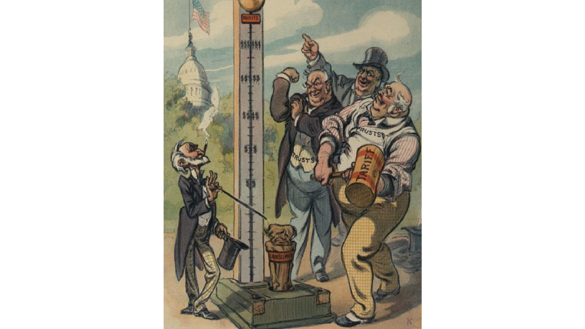 Consumer pushback to tariffs stretches back even farther. This Puck cartoon is from 1909, the last time U.S. tariffs were this high: